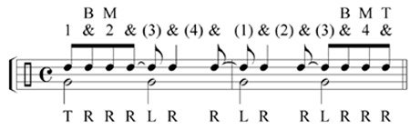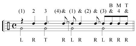 This is the rhythm for the first six (3 x 2) bars. The D minor and G chords are dragged forward (anticipated). The BMT refers to the bottom, middle, top of the G chord.