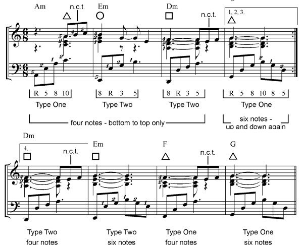 This realisation uses two left hand accompaniment patterns. We used them before, in Module Nine. Recall how the two patterns are made out of the three chord tones of the root position triad.
