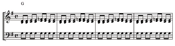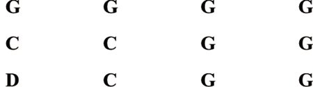 The music examples you’ve seen so far – like the one below – are all four bars’ worth of music. Here is the written-out music for the first G position part of the twelve-bar chorus.