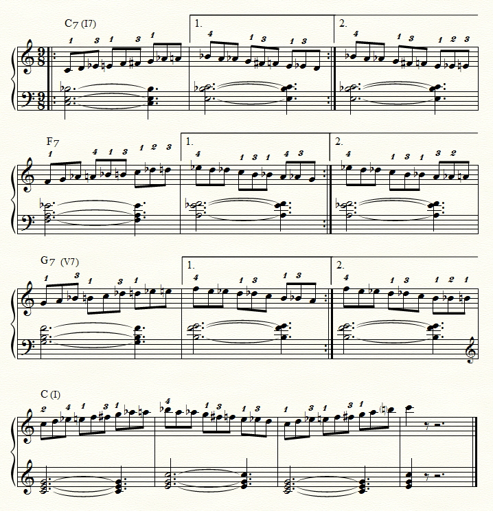 The second study - using C7, F7 and G7 - is more true to its 12-bar I-IV-V roots.