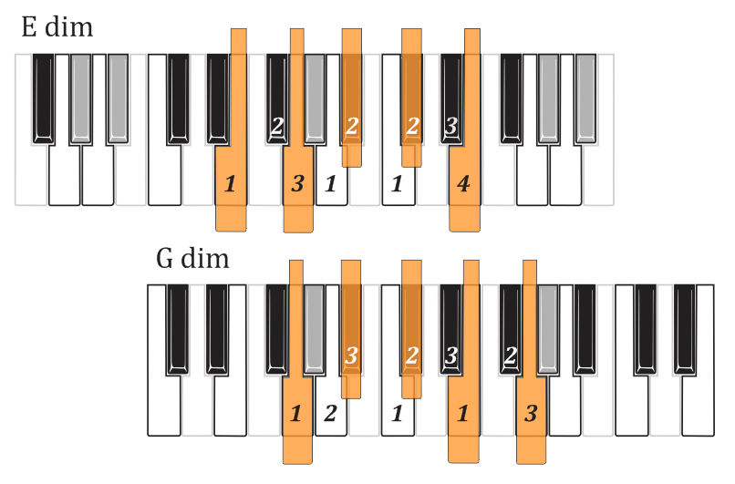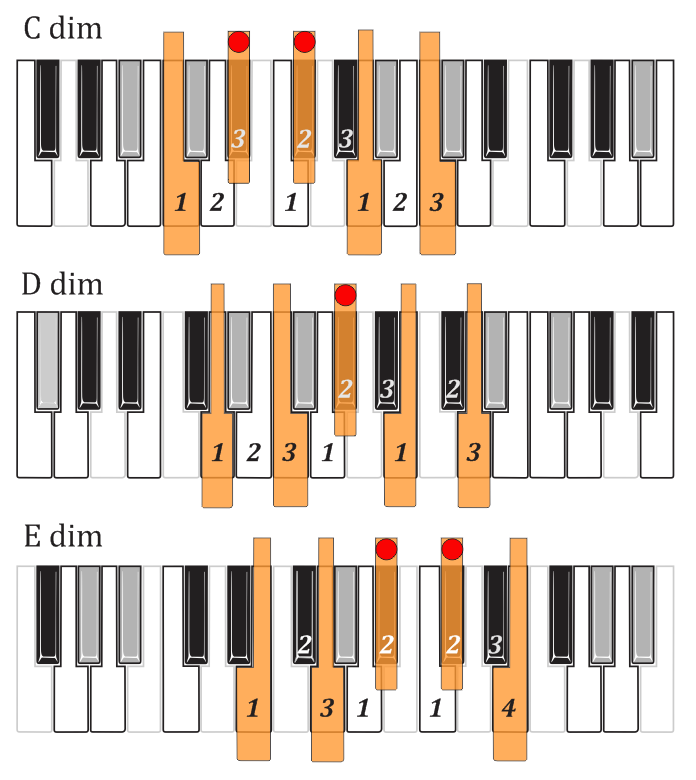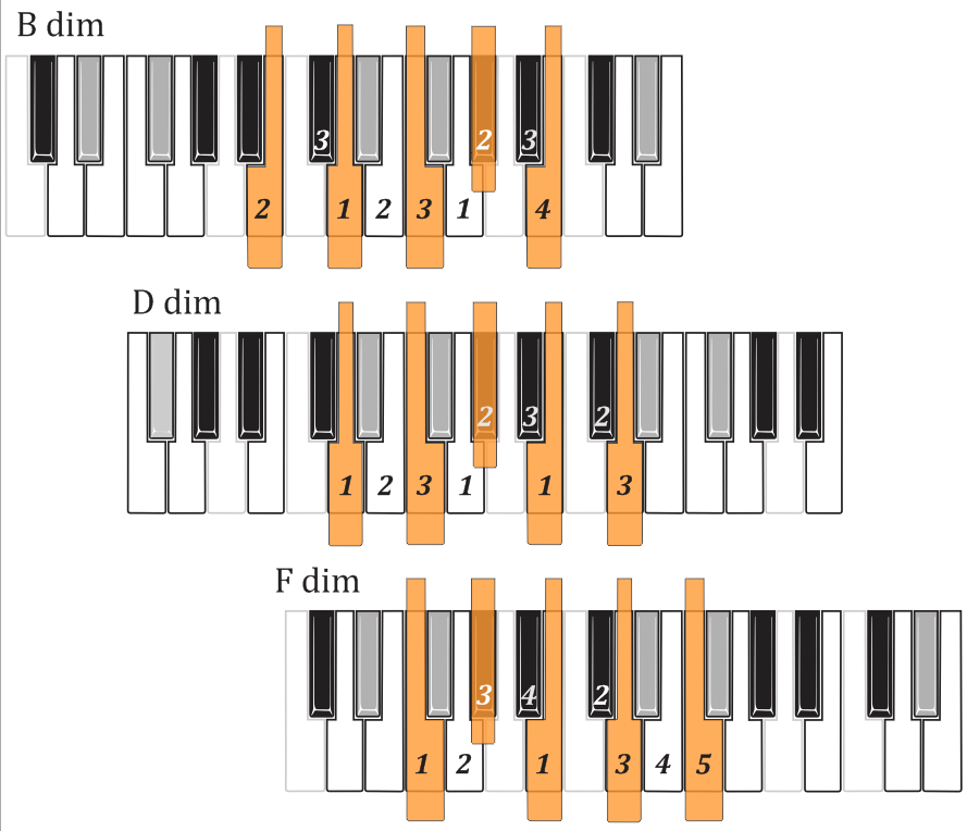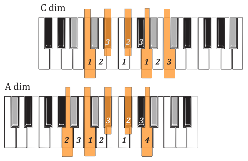 The white-key diminished scales you're now familiar with also provide whole-step/half-step diminished scales starting on any black key diminished chord tone. Just step down or up in minor thirds (three semitones) to the next white key, and there is the white key tonic which gives the scale-tones and the fingering.