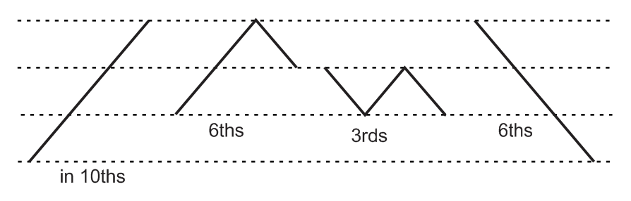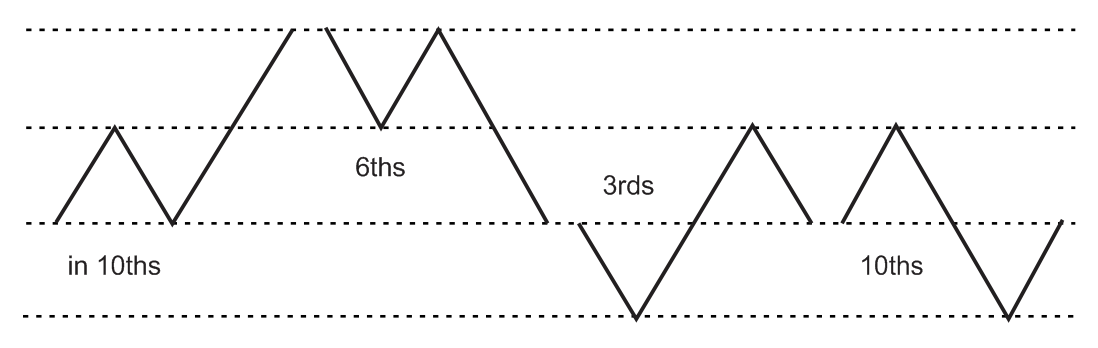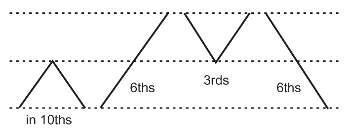 Play the patterns: 1. in 10ths; 2. in 6ths; 3. in 3rds; 4. in 6ths.