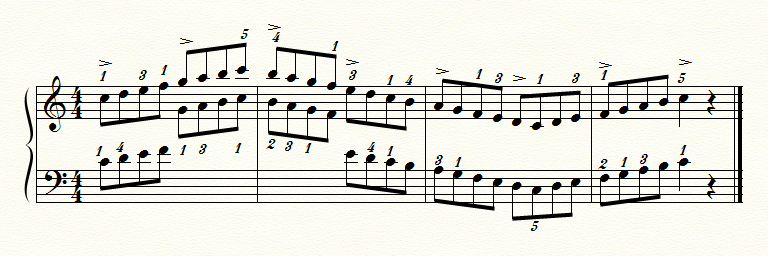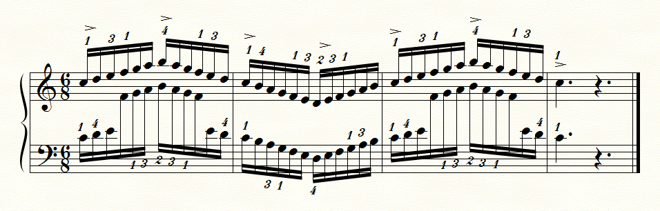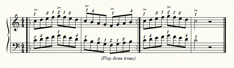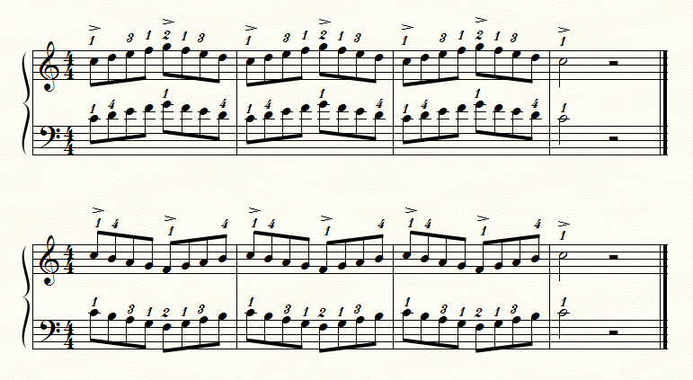 Then hands together. Start going down as well as going up. Keep a firm every-four-notes stress going.