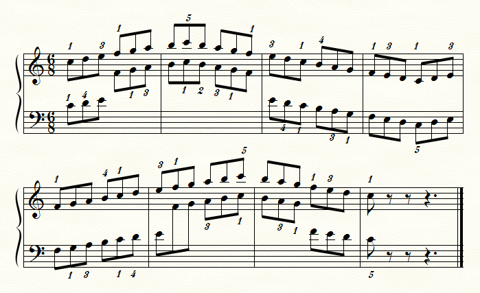 Musicarta tackles the problem head on with a scale practice pattern for Group One scales (C, G, D, A, and E) called ‘From Middle Thumbs’. You learn the two-octave scales from the spot where things usually go wrong – the middle of the two-octave scale where the thumbs play together – so you know the hardest part best of all.