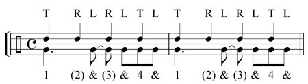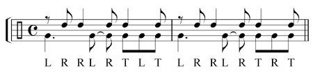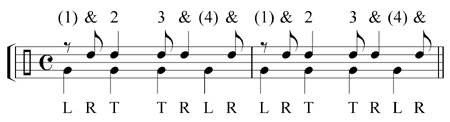 The last beat and rhythm riff in this module is the most advanced. Follow the build-up method, tapping each hand separately, counting out loud and using the TLR analysis.