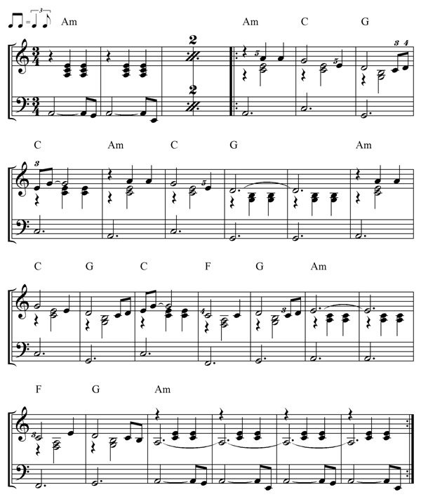 Now you try to ‘meld’ (to play together) the melody and the right hand chords in a three-four rhythm.