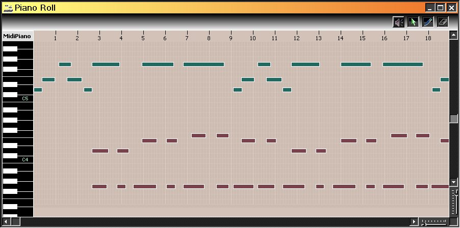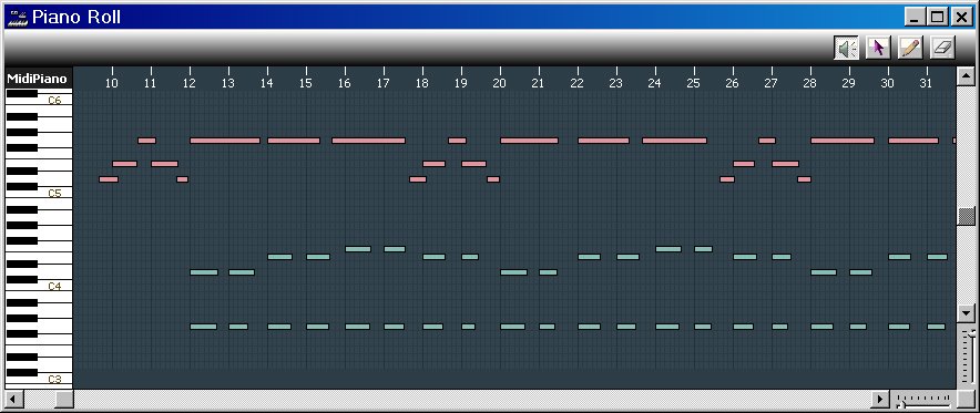 Looking more closely, you see/hear that the left hand is playing ‘straight quavers’ and marches right up the flattened seventh and down again. Here are a few bars from the MidiPiano Piano Roll pane.